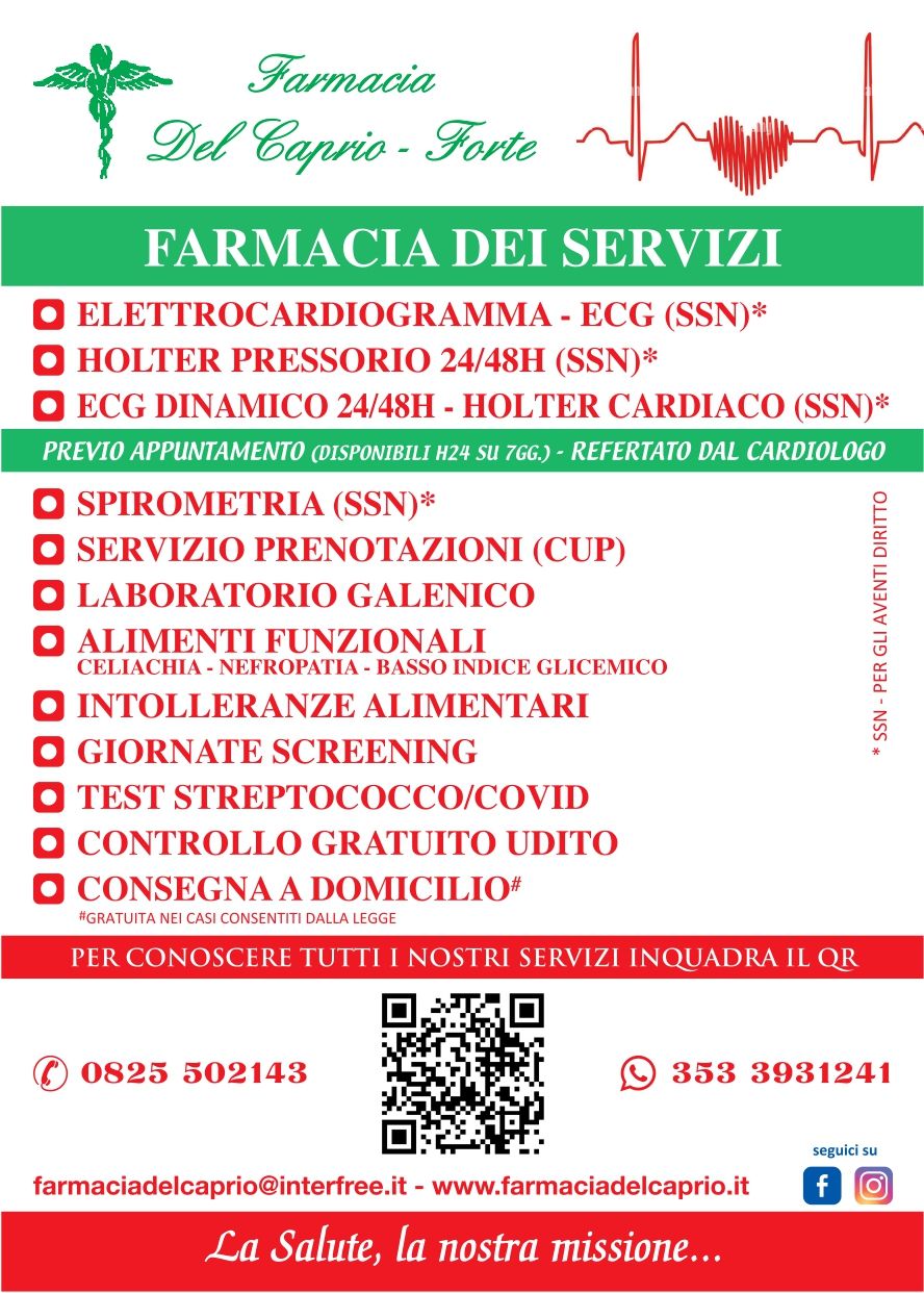 Presso la Farmacia del Caprio, sita a Montoro in provincia di Avellino, potrete trovare un'ampia scelta di servizi e prodotti farmaceutici. Se volete saperne di più sui servizi offerti dalla farmacia non esitate a chiamarci! In alternativa, venite direttamente a trovarci in sede e richiedete consiglio allo staff.